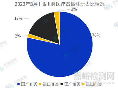 2023年3月,國家藥監(jiān)局共批準注冊醫(yī)療器械產(chǎn)品1356項。其中,國產(chǎn)第Ⅱ類醫(yī)療器械產(chǎn)品1063項,國產(chǎn)第Ⅲ類醫(yī)療器械產(chǎn)品228項,進口第Ⅱ類醫(yī)療器械產(chǎn)品26項,進口第Ⅲ類醫(yī)療器械產(chǎn)品39項,國產(chǎn)占比95.2%。