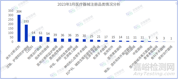 從產(chǎn)品類別來看,2023年3月中注冊醫(yī)療器械中,體外診斷試劑(304件),注輸、護理和防護器械(193件)、及口腔科器械(64件)注冊數(shù)量排名前三。3月體外診斷試劑產(chǎn)品注冊數(shù)較2月增多,超過了注輸、護理和防護器械注冊數(shù)量。