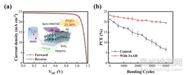 (a)預(yù)埋3AAH的柔性鈣鈦礦太陽(yáng)能電池器件結(jié)構(gòu)以及J-V特性曲線;(b)柔性器件在曲率半徑為5mm下的機(jī)械耐彎折性能。