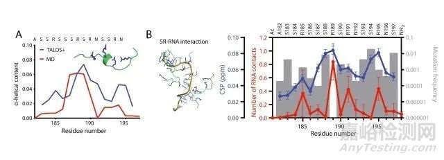 圖1:使用NMR研究SARS-CoV-2中核衣殼(NCP)蛋白A182–S197區(qū)域的特性,該區(qū)域含有高比例的絲氨酸和精氨酸(已知可結(jié)合RNA和蛋白質(zhì))。(A)化學(xué)位移分析(藍(lán))與分子動力學(xué)模擬(紅)一致,即該區(qū)域中的殘基非常靈活,在R189旁具有小型α-螺旋結(jié)構(gòu)傾向。(B)在多糖醛酸(一種簡化的RNA)存在的條件下重新運行模擬表明,精氨酸殘基和RNA磷酸基團(tuán)之間存在大量的分子間接觸,其中以R189最大。這與R189是A182–S197區(qū)域中唯一未在大多數(shù)已知SARS-CoV-2菌株中突變的殘基的觀察結(jié)果一致(灰條)。