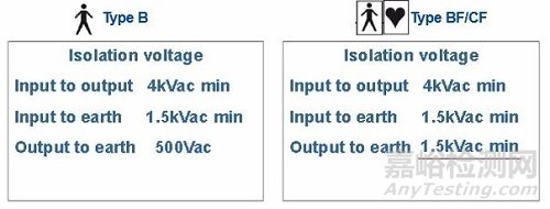 目前,歐美地區(qū)執(zhí)行的醫(yī)療標(biāo)準(zhǔn)是UL/EN60601第3版,中國執(zhí)行GB9706.1-2007版(等同60601第2版),正準(zhǔn)備過渡到第3版。醫(yī)療電源不僅需要滿足防電擊、防火等要求,而且要通過設(shè)計(jì),達(dá)到更高的電氣間隙、爬電距離和隔離電壓等級要求,以確保醫(yī)務(wù)人員或病人免受觸電等其他任何風(fēng)險(xiǎn)。通常要求電源的輸入跟輸出間滿足2xMOPPs。不同等級的醫(yī)療器械對隔離電壓要求如下: