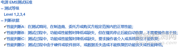 很顯然,一款EMC裕量足夠的醫(yī)療電源可以為整機(jī)EMC打下良好的基礎(chǔ),會有事半功倍的效果。目前,大部分醫(yī)療設(shè)備EMI都需要滿足EN55011 Class B,或同等級;而針對EMS,如ESD,EFT,Surge,Dips等,歐美地區(qū)執(zhí)行第4版要求,即IEC60601-1-2:2015,確保醫(yī)療設(shè)備和系統(tǒng)的基本安全和基本性能不受其它設(shè)備的干擾。值得強(qiáng)調(diào)的是,一定要了解電源是符合哪個(gè)等級下的哪類判據(jù),因?yàn)檫@是風(fēng)險(xiǎn)評估的重要參考依據(jù)。關(guān)于醫(yī)療電源EMS測試的等級及判斷依據(jù)可參考下圖: