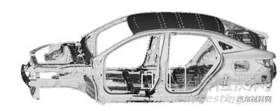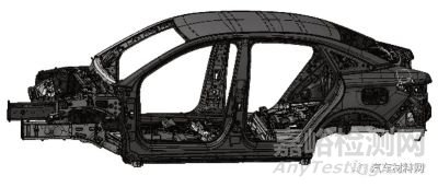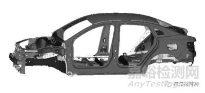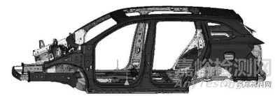 將白車身總成CAD數(shù)據(jù)(圖1)導(dǎo)入到CAE軟件中,進(jìn)行網(wǎng)格劃分并建立粘膠、焊接、螺接的連接關(guān)系,得到白車身總成CAE模型(圖2),白車身總成CAE模型中含有白車身總成各鈑金零件的外形、材料、厚度和連接關(guān)系信息。