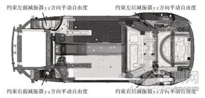 約束右后減振器座沿x軸、y軸和z軸平動(dòng)自由度,約束左前減振器座、左后減振器座和右前減振器座沿y軸和z軸平動(dòng)自由度,如圖3所示。