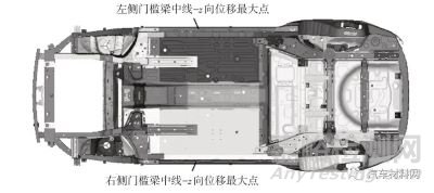 CAE模型計(jì)算完成后,打開計(jì)算結(jié)果文件(例如op2結(jié)果文件)分別在左側(cè)門檻梁和右側(cè)門檻梁中線位置(圖5)提取z向位移絕對值最大點(diǎn),其Z向位移分別記為Z_left和Z_right,如圖6所示。