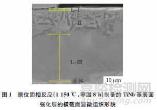 原位固相反應(yīng)(1150℃,等溫8h)制備的TiNb基表面強化層的橫截面顯微組織形貌如圖1所示。