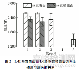 考慮到壓頭的尺寸效應(yīng)以及壓痕的邊緣效應(yīng),受表面強化層厚度的影響,從垂直表面方向測量L-II的顯微硬度,從垂直橫截面方向測量L-III的顯微硬度。L-II垂直表面和L-III垂直橫截面方向上硬度與載荷的關(guān)系如圖2所示。由圖2可知:隨著測試載荷的增加,L-II的顯微硬度均高于L-III的顯微硬度。另一方面,隨著載荷的增加,L-II的顯微硬度和L-III的顯微硬度均逐漸降低。理論上,載荷越大,其他外在因素對硬度的影響越小,越能體現(xiàn)材料的真實硬度。受強化層厚度的影響,在提高載荷的同時,還需要考慮邊緣效應(yīng)和基底效應(yīng)。采用觀察壓痕的形貌、分析頂角裂紋和棱邊裂紋的擴展行為、測量裂紋長度等方法,可以確定合適的測試載荷,以獲得更接近實際的強化層硬度。
