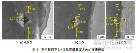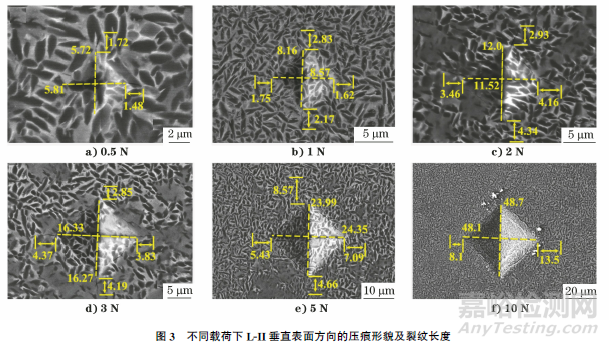 不同載荷下,L-II垂直表面方向的壓痕形貌及裂紋長度如圖3所示。在載荷為0.5N時,壓痕周圍裂紋較少,部分壓痕尖端還未有明顯的裂紋出現(xiàn)[見圖3a)]。隨著載荷的增加,壓痕頂角裂紋逐漸明顯且變長;同時,棱邊裂紋也逐漸明顯[見圖3d)],逐漸展現(xiàn)出相框裂紋的具體特征。相框裂紋的產(chǎn)生原因為高載荷下的高接觸應(yīng)力和基底效應(yīng)。當(dāng)載荷提高至10N時,相框裂紋從棱邊延伸至壓痕中心點,呈龜裂狀。造成這種現(xiàn)象的主要原因是強化層和基體所組成的“硬殼-軟底”結(jié)構(gòu)。在高應(yīng)力下,硬殼將應(yīng)力傳送至基體層,但軟質(zhì)基體層強度不足,會發(fā)生較大的變形,進而導(dǎo)致表面強化層發(fā)生崩塌,形成如圖3f)所示的相框裂紋。此時,由于應(yīng)力傳遞已經(jīng)與基體關(guān)聯(lián),并不能反映強化層的實際硬度。因此,結(jié)合壓痕形貌和裂紋擴展方式,可以判斷L-II測試時的臨界載荷為3N。由于當(dāng)載荷為3N時,壓痕棱邊已經(jīng)有相框裂紋形成,因此當(dāng)載荷為2N時,所測顯微硬度為L-II的最可信硬度,其平均硬度為2594.13HV。