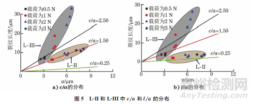 若想用壓痕法評價斷裂韌性,需先根據(jù)裂紋形貌判斷裂紋類型,再選擇適用的公式。在常規(guī)情況下,依據(jù)裂紋長度c(壓痕中心點至裂紋尖端的長度)或l(壓痕頂角至裂紋尖端的長度)與a(壓痕的半長度)的比值大小,可判斷裂紋的類型。對于多數(shù)材料:當(dāng)c/a小于2.5時,為巴氏裂紋;當(dāng)c/a 大于2.5時,為中位裂紋;當(dāng)l/a小于1.5時,為巴氏裂紋;當(dāng)l/a大于1.5時,為中位裂紋。L-II和L-III中c/a 和l/a 的分布如圖5所示。由圖5可知:在表面方向,隨著載荷的增加,L-II內(nèi)c/a 均小于2.5,且l/a均小于1.5。因此,L-II內(nèi)壓痕頂角的裂紋為巴氏裂紋。橫截面方向,L-III內(nèi)的c/a>2.5或l/a>1.5,因此L-III內(nèi)的裂紋為中位裂紋。