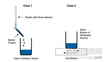 模擬沖洗過程的一個方法是在干凈的收集容器上方懸掛一個已涂布的材質(zhì)試樣,然后將沖洗液從表面沖過,并收集在收集容器中。另一個方法是在合適材料的燒杯底部涂布殘留物,讓殘留自然晾干,向燒杯中加入沖洗液并輕輕攪拌,攪拌時間同最終沖洗相同。采用移液管移出或從燒杯中倒出沖洗液并分析。第三種方法適用于沒有合適材質(zhì)燒杯的情況,在燒杯底部放置一個材質(zhì)試樣然后同第二種方法一樣模擬沖洗。