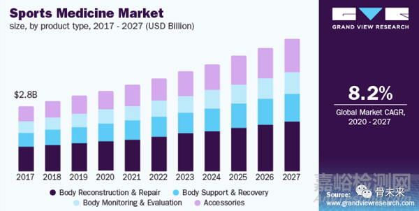 到2027年,全球運(yùn)動(dòng)醫(yī)學(xué)市場規(guī)模將達(dá)到152億美元,預(yù)計(jì)在預(yù)測期內(nèi)將以8.2%的復(fù)合年增長率(CAGR)增長。由于運(yùn)動(dòng)損傷的發(fā)生率不斷提高以及人們越來越多地參與體育和健身等相關(guān)活動(dòng),全球?qū)\(yùn)動(dòng)醫(yī)學(xué)的需求正在上升。此外,運(yùn)動(dòng)損傷將從主動(dòng)護(hù)理轉(zhuǎn)向預(yù)防性護(hù)理,這也會(huì)進(jìn)一步推動(dòng)運(yùn)動(dòng)醫(yī)學(xué)市場的發(fā)展。
