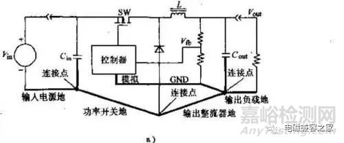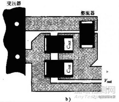 通常輸入電源和負載電流環(huán)路并沒有什么問題。這兩個環(huán)路上主要是在直流電流上疊加了一些小的交流電流分量。它們一般有專門的濾波器來阻止交流噪聲進入周圍的電路。輸入和輸出電流環(huán)路連接的位置只能是相應的輸入 輸出電容的接線端。輸入環(huán)路通過近似直流的電流對輸入電容充電,但它無法提供開關(guān)電源所需的脈沖電流。輸入電容主要是起到高頻能量存儲器的作用。類似地,輸出濾波電容存儲來自輸出整流器的高頻能量,使輸出負載環(huán)能以直流方式汲取能量。因此,輸入和輸出濾波電容接線端的放置很重要。如果輸入或輸出環(huán)與功率開關(guān)或整流環(huán)的連接沒有直接接到電容的兩端,交流能量就會從輸入或輸出濾波電容上流進流出,并通過輸入和輸出電流環(huán)“逃逸”到外面環(huán)境中。