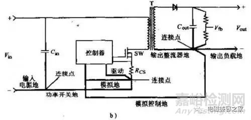 每個開關(guān)電源中都有一個交流電壓最大的節(jié)點,這個節(jié)點就是功率開關(guān)漏極(或集電極)。無隔離DC-DC變換器中,這個節(jié)點與電感和續(xù)流二極管相連。變壓器隔離拓撲中,變壓器有多少個繞組,就有多少個交流節(jié)點。但從電氣上看,它們代表同一個節(jié)點,只是經(jīng)變壓器映射成這么多節(jié)點。對每一個交流節(jié)點都要單獨進行仔細考慮。