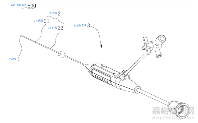 因此提供了一種穿刺系統(tǒng)及其控制手柄。控制手柄包括外殼和控制機構(gòu)。外殼內(nèi)具有容置空間;控制機構(gòu)包括操作件、開關(guān)組件和導(dǎo)電絲,導(dǎo)電絲遠端伸出外殼并用于與電極頭電性連接,導(dǎo)電絲近端與開關(guān)組件或外部能源電性連接,操作件能夠在外力作用下移動,使開關(guān)組件實現(xiàn)電路導(dǎo)通,進而實現(xiàn)導(dǎo)電絲與外部能源的導(dǎo)通。該控制手柄通過對操作件的操作,使開關(guān)組件實現(xiàn)電路導(dǎo)通,進而實現(xiàn)導(dǎo)電絲與外部能源的導(dǎo)通。即施術(shù)者能夠通過對操作件的操作即實現(xiàn)電路的通斷,非常方便。
