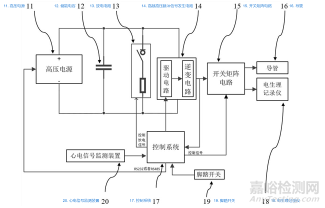 公開了一種高壓電脈沖消融與電生理記錄儀協(xié)同工作的裝置,涉及醫(yī)療器械領(lǐng)域,包括高壓電源、儲能電容、放電電路、高頻高壓脈沖信號發(fā)生電路、開關(guān)矩陣電路、控制系統(tǒng);儲能電容分別與高壓電源、放電電路和高頻高壓脈沖信號發(fā)生電路連接;開關(guān)矩陣分別與高頻高壓脈沖信號發(fā)生電路、導(dǎo)管和電生理記錄儀連接;控制系統(tǒng)分別與高壓電源、放電電路、高頻高壓脈沖信號發(fā)生電路、開關(guān)矩陣電路、心電信號監(jiān)測和腳踏開關(guān)連接。本發(fā)明可以在電生理消融過程中通過消融導(dǎo)管實時觀察采集、顯示和存儲心臟電生理信號,并且生理信號不會受到高壓電脈沖信號的干擾導(dǎo)致有用信號被覆蓋,測量結(jié)果真實有效。