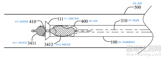 7、鞘管組件的雙層鞘管通道,配合取栓支架取栓,避免取栓支架在抓取血栓進入雙層鞘管通道過程中因收縮變形導(dǎo)致加劇血栓破碎的情況,進一步包覆大塊血栓。