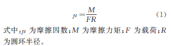 在鋁合金試樣上截取尺寸為7mm×7mm×30mm的方塊試樣,表面粗糙度Ra為0.40μm;在不銹鋼試樣上截取尺寸為?40mm×?16mm×10mm的圓環(huán)試樣,外圓表面粗糙度Ra為0.40μm。按照GB/T 12444-2006,在摩擦磨損試驗機上進行圓環(huán)-方塊摩擦磨損試驗,試驗溫度為室溫24℃,相對濕度為(50±5)%,方塊試樣壓在圓環(huán)試樣上,載荷為245N,圓環(huán)試樣轉(zhuǎn)速為200r·min-1,相對方塊試樣的線速度為0.42m·s-1,試驗時間為120min。采用2種潤滑方式,一是干摩擦,二是試驗前涂抹XG/LT二硫化鉬鋰基潤滑脂,試驗過程中不再加潤滑脂。在摩擦試驗過程中由儀器自動記錄力矩隨時間的變化,通過力矩計算摩擦因數(shù),平均摩擦因數(shù)取試驗60~120min時摩擦因數(shù)的平均值。摩擦因數(shù)計算公式如下: