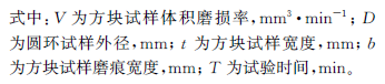 采用三維激光掃描電子顯微鏡觀察試樣表面摩擦磨損形貌。按照GB/T 12444—2006,用游標卡尺測量方塊試樣表面的磨痕寬度,在整個磨痕長度方向的中間及兩側(cè)1/4長度處進行測量,取平均值。計算方塊試樣平均體積磨損率,公式如下:
