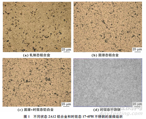 將不同狀態(tài)鋁合金試樣以及時效態(tài)不銹鋼試樣均加工成尺寸為?20mm×14mm的金相試樣,經(jīng)磨拋,腐蝕液腐蝕后,在光學顯微鏡下觀察顯微組織。其中,2A12鋁合金使用的腐蝕液由體積比1∶5∶15的氫氟酸、硝酸和鹽酸組成,17-4PH不銹鋼使用的腐蝕液由體積比1∶2的硝酸和鹽酸組成。
