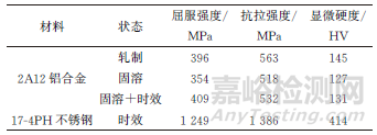 表1 不同狀態(tài)2A12鋁合金和時效態(tài)17-4PH不銹鋼的力學性能
