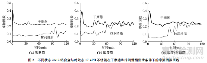 由圖2可見:在整個摩擦磨損過程中,軋制態(tài)2A12鋁合金與17-4不銹鋼在抹潤滑脂潤滑條件下的摩擦因數(shù)均明顯小于在干摩擦條件下;固溶態(tài)、固溶+時效態(tài)2A12鋁合金與17-4不銹鋼在抹潤滑脂潤滑條件下的摩擦因數(shù)在摩擦磨損前期明顯小于干摩擦條件下,而在摩擦磨損中后期與干摩擦條件下相近。