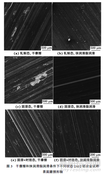 由圖3可見:3種狀態(tài)2A12鋁合金試樣在干摩擦條件下的表面劃痕明顯,為金屬間的劃傷、擦傷與犁溝,主要發(fā)生磨粒磨損,同時表面還出現(xiàn)少量磨損脫落的黏附物,說明存在少量黏著磨損;在抹潤滑脂潤滑條件下3種狀態(tài)鋁合金試樣表面主要存在劃痕,局部散落著顆粒狀附著物,其磨損機制仍以磨粒磨損為主、黏著磨損為輔。