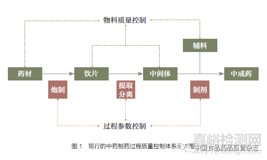 先進(jìn)的制藥過(guò)程質(zhì)量控制系統(tǒng)能夠適時(shí)檢測(cè)關(guān)鍵物料質(zhì)量參數(shù)和過(guò)程狀態(tài)參數(shù),及時(shí)調(diào)整關(guān)鍵過(guò)程參數(shù),保障所產(chǎn)藥品質(zhì)量與原定的藥品質(zhì)量概貌一致,從而“免檢”實(shí)時(shí)放行藥品[3]。因此,科學(xué)構(gòu)建中藥制藥過(guò)程質(zhì)量控制體系是解決中藥工業(yè)領(lǐng)域當(dāng)今“最緊急、最緊迫”問(wèn)題的關(guān)鍵技術(shù)路徑。現(xiàn)行的中藥制藥過(guò)程質(zhì)量控制體系如圖1所示,一般包括物料質(zhì)量控制及過(guò)程參數(shù)控制。