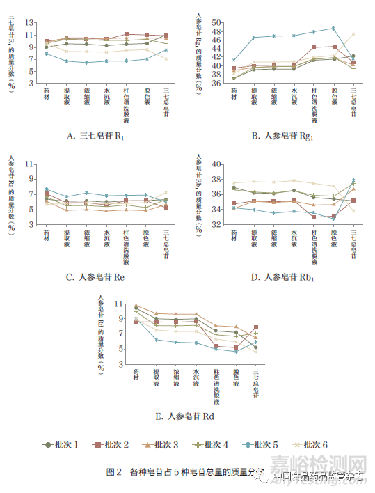 根據(jù)國(guó)家藥典委員會(huì)相關(guān)規(guī)定,三七總皂苷是采用三七藥材,經(jīng)過(guò)粉碎、醇提、水沉、柱色譜、脫色、精制、濃縮和干燥等一系列單元工藝制得。筆者曾考察了不同批次三七生產(chǎn)三七總皂苷過(guò)程中的量值傳遞情況[4]。分別檢測(cè)了6批次三七藥材、提取液、濃縮液、水沉液、柱色譜洗脫液、脫色液以及三七總皂苷產(chǎn)品中三七皂苷R1、人參皂苷Rg1、人參皂苷Re、人參皂苷Rb1和人參皂苷Rd 5種皂苷含量。計(jì)算了各個(gè)物料中每種皂苷在這5種皂苷總量中的質(zhì)量分?jǐn)?shù),具體結(jié)果如圖2所示。