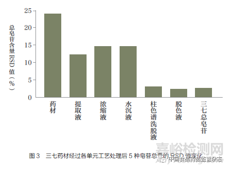 筆者測(cè)定了各單元工藝處理后6批次三七5種皂苷總量的相對(duì)標(biāo)準(zhǔn)偏差(RSD)[4],如圖3所示。該數(shù)值體現(xiàn)了三七5種皂苷總量在生產(chǎn)過(guò)程中精密度的變化,體現(xiàn)了各單元工藝對(duì)提升三七總皂苷批次間一致性的貢獻(xiàn)大小。從圖3可知,藥材中5種皂苷總量相差較大,RSD超過(guò)20%。經(jīng)過(guò)提取工藝后,RSD下降到15%以下。經(jīng)過(guò)柱色譜工藝后,RSD更是下降到5%以下。這說(shuō)明當(dāng)處理多批次三七時(shí),柱色譜工藝對(duì)提升產(chǎn)品質(zhì)量一致性貢獻(xiàn)最大,是影響其精密制造的關(guān)鍵工藝,提取工藝的貢獻(xiàn)次之。
