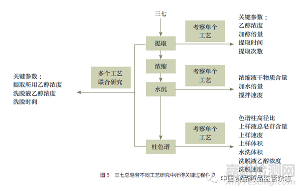 從圖2中可知,在提取過(guò)程中人參皂苷Rg1的質(zhì)量分?jǐn)?shù)略有增加,而人參皂苷Rd的質(zhì)量分?jǐn)?shù)略有下降,但改變量大多在3%以下。提取后的各單元工藝處理后,除人參皂苷Rd的質(zhì)量分?jǐn)?shù)稍有下降外,其他皂苷的質(zhì)量分?jǐn)?shù)總體變化不大。這意味著,最終所得三七總皂苷確實(shí)主要是從藥材提取分離“傳遞”而來(lái),而非化學(xué)反應(yīng)“轉(zhuǎn)化”而來(lái)。那么,作為原料的三七質(zhì)控指標(biāo)應(yīng)該考慮控制上述5種皂苷的含量。