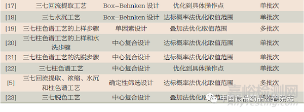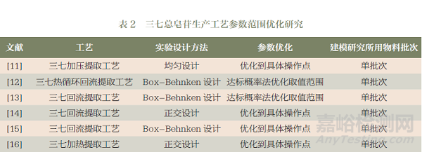 表2中列出了三七總皂苷生產(chǎn)工藝相關(guān)文獻(xiàn)報(bào)道中的實(shí)驗(yàn)設(shè)計(jì)方法。實(shí)驗(yàn)設(shè)計(jì)方法包括:中心復(fù)合設(shè)計(jì)、Box-Behnken設(shè)計(jì)、確定性篩選設(shè)計(jì)、單因素設(shè)計(jì)、正交設(shè)計(jì)和均勻設(shè)計(jì)。實(shí)驗(yàn)設(shè)計(jì)方法的選擇和待研究參數(shù)個(gè)數(shù)及后續(xù)建模方法有關(guān)。若考慮采用二階多項(xiàng)式建模,用前3個(gè)實(shí)驗(yàn)設(shè)計(jì)方法較好。當(dāng)所研究的參數(shù)超過(guò)5個(gè)時(shí),中心復(fù)合設(shè)計(jì)和Box-Behnken設(shè)計(jì)的實(shí)驗(yàn)次數(shù)都較多,建議采用確定性篩選設(shè)計(jì)。