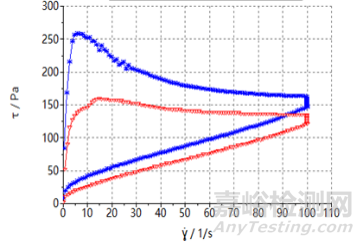 觸變性是一種可逆的溶膠現(xiàn)象,普遍存在于高分子懸浮液中,代表流體粘度對時間的依賴性。流變儀可測定半固體制劑的觸變環(huán),觸變環(huán)面積越大,說明制劑需要更久的時間回復(fù)初始黏度及微觀結(jié)構(gòu),進而表明制劑內(nèi)部結(jié)構(gòu)更細碎也更易碎,為制劑的處方工藝篩選指明方向。