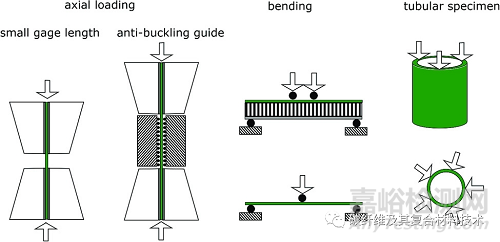 這些測(cè)試策略是靜態(tài)壓縮測(cè)試的既定方法,有時(shí)也用于疲勞測(cè)試。然而,這兩種方法中的夾具數(shù)量都很多,只有一些夾具可以進(jìn)行疲勞測(cè)試。這些普遍接受的壓縮試驗(yàn)方法由不同的試樣幾何形狀或加載條件補(bǔ)充。下圖中概述幾張常見的壓縮測(cè)試的概念裝置。