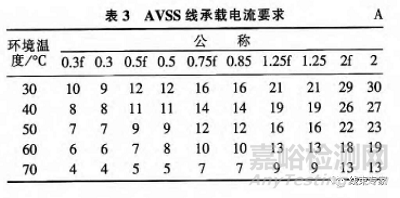 本車型選用日標導線,導線耐熱劣化壽命曲線如圖4所示。由圖4可知,如采用AVSS(超薄壁型PVC絕緣低壓電線),滿足10年設(shè)計壽命要求(累計通電時間約為10000h),導線額定溫度不允許超過80℃,根據(jù)公式(3),即可知導線在相應環(huán)境溫度下承載電流要求。如表3所示。