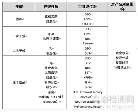 二次干燥通過(guò)解吸去除未冷凍的結(jié)合水,以避免儲(chǔ)存期間出現(xiàn)蛋白質(zhì)穩(wěn)定性問(wèn)題。為了避免樣品崩潰,應(yīng)逐漸提高板層溫度,一般不超過(guò)50°C,時(shí)間通常不超過(guò)6h。干燥結(jié)束后,產(chǎn)品中的殘留水分為應(yīng)符合要求。根據(jù)QbD原則,過(guò)程分析技術(shù)的主要目的是提高過(guò)程效率并保證產(chǎn)品的關(guān)鍵質(zhì)量屬性。近年來(lái),已經(jīng)開(kāi)發(fā)出用于在線和實(shí)時(shí)測(cè)量的新工具,如溫度遠(yuǎn)程監(jiān)控系統(tǒng)和TrackSense Pro系統(tǒng),基于對(duì)產(chǎn)品溫度、板層溫度和腔室壓力的監(jiān)控,可以確定一次干燥甚至二次干燥的終點(diǎn)。LyoTrack系統(tǒng)基于光學(xué)發(fā)射光譜測(cè)量干燥室內(nèi)的水分濃度,從而獲得更準(zhǔn)確的干燥終點(diǎn)。壓力溫度測(cè)量是一種壓力上升測(cè)試,當(dāng)干燥室中的蒸汽壓力不再上升時(shí),初級(jí)干燥完成。此外,通過(guò)使用近紅外和拉曼探頭,可以監(jiān)測(cè)凍干配方的中間參數(shù),例如過(guò)程誘導(dǎo)的轉(zhuǎn)變、結(jié)晶、固態(tài)化、多晶型轉(zhuǎn)化和殘余水分含量。過(guò)程分析技術(shù)工具以及相應(yīng)的屬性如下表。
