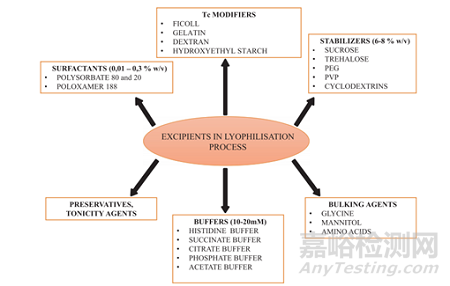 選擇合適輔料能有助于產(chǎn)品在凍干過(guò)程中獲得理想的質(zhì)量屬性和穩(wěn)定性,并降低生產(chǎn)的時(shí)間和經(jīng)濟(jì)成本,提高產(chǎn)量。下圖為生物藥凍干制劑常用輔料選用: