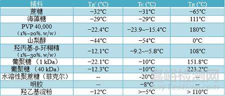 保證穩(wěn)定性的重要因素是穩(wěn)定劑和蛋白質(zhì)之間的適當(dāng)比例。糖和蛋白質(zhì)之間的摩爾比應(yīng)至少為360:1【3】。添加過(guò)量糖會(huì)降低Tg'。優(yōu)化凍干過(guò)程的方法是選擇具有高穩(wěn)定性效果和高臨界溫度T?和Tc的替代輔料,高于蔗糖和海藻糖。包含具有高Tg'和Tc改性劑的輔料,允許產(chǎn)品在更高的干燥溫度下進(jìn)行初級(jí)干燥而不會(huì)破壞產(chǎn)品結(jié)構(gòu)。此外,Tc改性劑和填充劑通過(guò)形成晶格的組合可以在產(chǎn)品溫度高于Tc的情況下進(jìn)行初級(jí)干燥,而不影響蛋白質(zhì)穩(wěn)定性和不發(fā)生塌陷【4】。下表列出的穩(wěn)定劑輔料(除山梨醇外)Tg'都高于蔗糖(這意味著可能使用更高的干燥溫度來(lái)縮短干燥過(guò)程)。為了確保蛋白質(zhì)的穩(wěn)定性并防止相分離,建議將蔗糖和葡聚糖結(jié)合使用【2】。