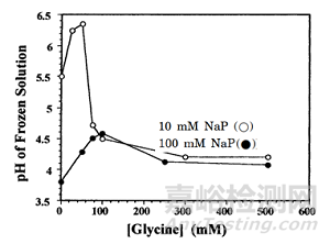 對(duì)于凍干制劑,最常用的緩沖液是非氨基酸緩沖液,例如磷酸緩沖液、乙酸緩沖液、檸檬酸緩沖液和琥珀酸緩沖液。對(duì)于氨基酸緩沖液的使用,組氨酸緩沖液是使用最廣泛的。檸檬酸鹽緩沖液通常是最先考慮的,因?yàn)樗柠}組分在冷凍過(guò)程中表現(xiàn)出低結(jié)晶傾向,并且具有高臨界溫度Tc,這有助于縮短初級(jí)干燥時(shí)間。在冷凍過(guò)程中需要避免緩沖鹽的結(jié)晶,因?yàn)榻Y(jié)晶會(huì)改變體系pH值并導(dǎo)致蛋白質(zhì)不穩(wěn)定(在磷酸鈉溶液的冷凍過(guò)程中,二鈉鹽的結(jié)晶會(huì)導(dǎo)致pH值降低至3個(gè)pH單位)。雖然一些情況下添加填充劑如甘露醇和甘氨酸,可能會(huì)促進(jìn)緩沖鹽結(jié)晶,但填充劑對(duì)緩沖鹽的結(jié)晶影響主要取決于填充劑的濃度,濃度<50 mM的甘氨酸抑制磷酸鹽緩沖液中二鈉鹽的結(jié)晶,而當(dāng)濃度較高時(shí),結(jié)晶速率明顯增加,如下圖。此外,冷凍過(guò)程中磷酸鹽緩沖液的急劇pH變化也會(huì)導(dǎo)致蛋白質(zhì)的不穩(wěn)定,但通常加入穩(wěn)定劑后處于無(wú)定型狀態(tài)的穩(wěn)定劑能很大程度緩解緩沖液結(jié)晶和pH變化引起的蛋白質(zhì)不穩(wěn)定,各輔料起到協(xié)同作用【11】。