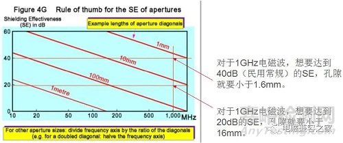 在一個完美的屏蔽殼體上開一個洞,相當于構成一個半波共振縫隙天線,屏蔽效能SE與孔的最大尺寸d、電磁波波長λ關系如下:
