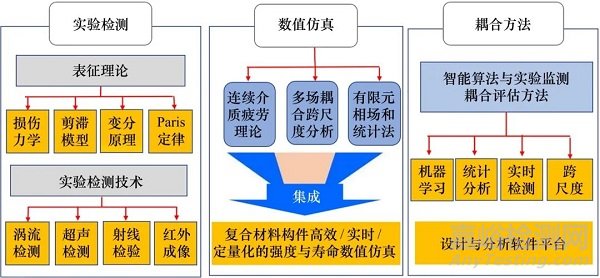 從復(fù)合材料損傷機(jī)理角度出發(fā),利用連續(xù)介質(zhì)損傷力學(xué)、剪滯模型、變分理論、帕里斯定律等理論,表征復(fù)合材料與結(jié)構(gòu)的損傷、缺陷特征并建立結(jié)構(gòu)參數(shù)隨載荷作用變化的數(shù)值模型,據(jù)此開展強(qiáng)度與壽命仿真評價研究,是當(dāng)前的通行做法;采用基于無損檢測技術(shù)的多尺度缺陷特征及結(jié)構(gòu)參數(shù),建立含真實(shí)缺陷的三維有限元模型,據(jù)此預(yù)測復(fù)合材料的疲勞壽命,為復(fù)合材料剩余強(qiáng)度及疲勞壽命評估理論和技術(shù)研究提供可靠依據(jù),也是常規(guī)性研究。值得指出的是,傳統(tǒng)的強(qiáng)度與壽命評價方法已不能完全適應(yīng)材料應(yīng)用的新形勢,需要集成連續(xù)介質(zhì)疲勞理論、多場耦合跨尺度分析方法、有限元相場、有限元統(tǒng)計(jì)法,建立復(fù)合材料構(gòu)件數(shù)字仿真新方法;依托智能算法與實(shí)驗(yàn)檢測手段,建立復(fù)合材料構(gòu)建設(shè)計(jì)與分析軟件平臺,發(fā)展更高效、更精確的強(qiáng)度與壽命評價方法體系(見圖5)。