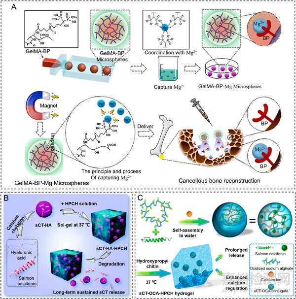 干骺端主要由小梁骨組成,易發(fā)生骨質(zhì)疏松。干骺端小梁骨孔隙度較大,靶點(diǎn)主要在骨小梁的表面,因此水凝膠的直徑?jīng)]有限制。此外,骨基質(zhì)的主要成分是羥基磷灰石(Ha),通常被認(rèn)為是電中性材料,電荷修飾不適合做干骺端靶向。在水凝膠表面進(jìn)行骨基質(zhì)或各種骨細(xì)胞的靶向分子修飾和在水凝膠中嵌入骨基質(zhì)或細(xì)胞靶向藥物是骨靶向水凝膠的兩種主要策略。雙膦酸鹽是骨基質(zhì)靶向常見靶頭,有研究利用微流控技術(shù)制備GelMA水凝膠微球,表面接枝雙膦酸鹽,微球通過激發(fā)“磁鐵”功能捕獲Mg2+治療骨質(zhì)疏松癥(圖4A)。直接將降鈣素等骨靶向藥物搭載進(jìn)入水凝膠也是可行策略,有研究開發(fā)一種熱敏可注射羥丙基幾丁質(zhì)水凝膠,用于持續(xù)釋放鮭魚降鈣素,增強(qiáng)成骨和低鈣作用(圖4B、C)。