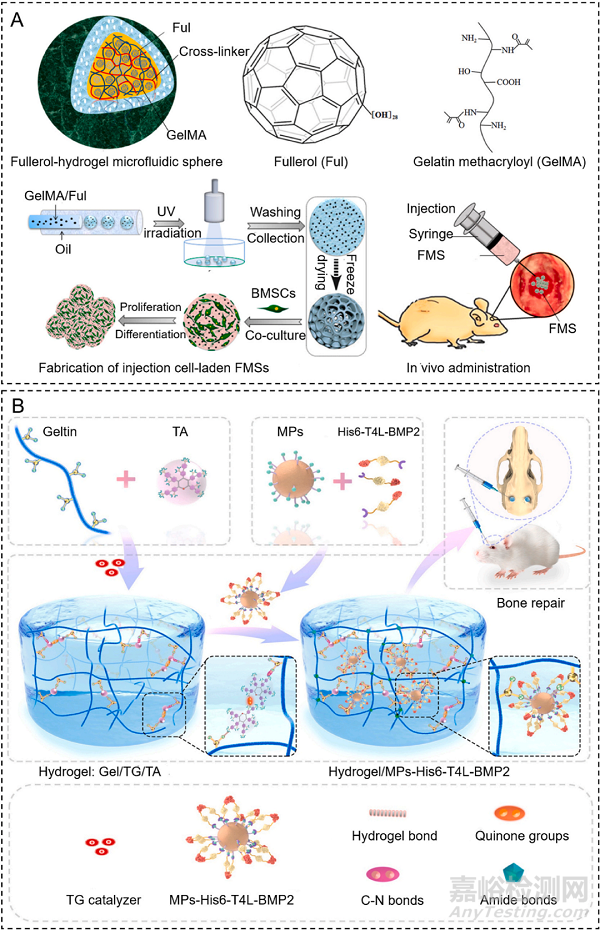 骨干骨折和感染引起的骨缺損是臨床上的重大挑戰(zhàn)。在間接骨愈合過程中,軟骨內(nèi)成骨是骨修復(fù)的主要過程。骨髓間充質(zhì)干細(xì)胞、肥厚軟骨細(xì)胞、血管內(nèi)皮細(xì)胞、成骨細(xì)胞和破骨細(xì)胞都參與了這一生物過程。針對軟骨內(nèi)成骨的骨基質(zhì)或一些重要細(xì)胞是骨干部分骨靶向水凝膠構(gòu)建的策略。有研究將高度分散的富勒醇納米晶體加入到水凝膠微球中,利用微流控技術(shù)構(gòu)建了富勒醇-水凝膠微流控球(FMSs)。原位注射FMSs靶向骨骼間充質(zhì)干細(xì)胞,可調(diào)節(jié)干細(xì)胞氧化還原穩(wěn)態(tài),促進(jìn)骨愈合(圖6A)。作為靶向藥庫,BMP是最常見的靶向促成骨藥物,通過在復(fù)合水凝膠中時(shí)空和控制傳遞基因工程BMP-2可以增強(qiáng)骨再生(圖6B)。