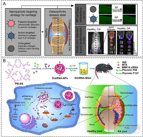 細(xì)胞外基質(zhì)(ECM)和關(guān)節(jié)軟骨細(xì)胞是靶向材料的潛在靶點(diǎn)。靶向水凝膠通過與軟骨中的分子(如膠原蛋白II、透明質(zhì)酸和硫酸軟骨素)相互作用的特殊表面部分進(jìn)行主動(dòng)靶向。另一方面,靶向性水凝膠微球通過尺寸和電荷等生物物理和生化特性進(jìn)行被動(dòng)靶向(圖2A)。軟骨中微凝膠基水凝膠的推薦尺寸小于30nm,帶正電荷的水凝膠可以靶向軟骨ECM。在骨關(guān)節(jié)炎等關(guān)節(jié)相關(guān)疾病中,疾病病理過程中會(huì)出現(xiàn)特異性分子,從而為特定藥物提供靶點(diǎn)。除了水凝膠微球,構(gòu)建搭載具有軟骨靶向藥物的水凝膠藥物緩釋系統(tǒng)也是軟骨靶向水凝膠的構(gòu)建策略(圖2B)。