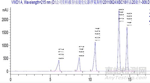 當(dāng)月旭超高效色譜柱(Ultimate® XB-C18,4.6×50mm,1.8μm)在常規(guī)的液相色譜儀上使用時,由于系統(tǒng)死體積大,會影響到峰形,下圖是羅氟斯特項目,可以看到色譜峰都出現(xiàn)了前延的現(xiàn)象。