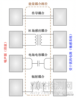 圖 1 概略介紹了噪聲源與受干擾電路之間基本 EMI 耦合模式特別是電感或 H 場(chǎng)耦合需要 di/dt 較高的時(shí)變電流源和兩條磁耦合回路(或帶有返回路徑的平行導(dǎo)線)。另一方面,電容或 E 場(chǎng)耦合需要 dv/dt 較高的時(shí)變電壓源和兩塊緊鄰的金屬板。這兩種機(jī)制均屬于近場(chǎng)耦合,其中的噪聲源與受干擾電路非常接近,可使用近場(chǎng)嗅探器進(jìn)行測(cè)量。