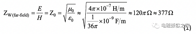 圖 3 所示的波阻抗等于電場(chǎng)強(qiáng)度與磁場(chǎng)強(qiáng)度之比。遠(yuǎn)場(chǎng)區(qū)域中的 E 和 H 分量同相,因此遠(yuǎn)場(chǎng)阻抗呈阻性,具體值可通過麥克斯韋方程(如方程 1 所示)的平面波解決方案計(jì)算: