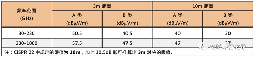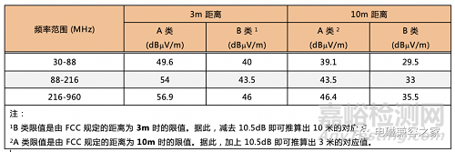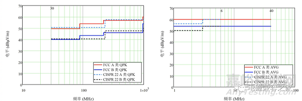 圖 4:FCC 第 15 部分和 CISPR 22 的 A 類和 B 類輻射限值(對(duì)于低于和高于 1GHz 這兩種條件,分別使用 QP 和 AVG 檢測(cè)器)