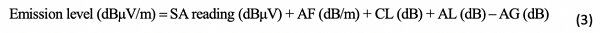 輻射發(fā)射測(cè)試以每米若干分貝/微伏 (dB/mV) 為單位校準(zhǔn)電場(chǎng)強(qiáng)度。天線因子 (AF) 是天線平面產(chǎn)生的電場(chǎng) (mV/m) 與頻譜分析儀 (SA) 或掃描 EMI 接收器測(cè)得的電壓 (dB/mV) 之比。一般而言,校正的發(fā)射電平由方程 3 推導(dǎo)得出,推導(dǎo)時(shí)將 AF、電纜損耗 (CL)、衰減器和 RF 限制器損耗因子 (AL) 以及放大器預(yù)增益 (AG) 考慮在內(nèi)。