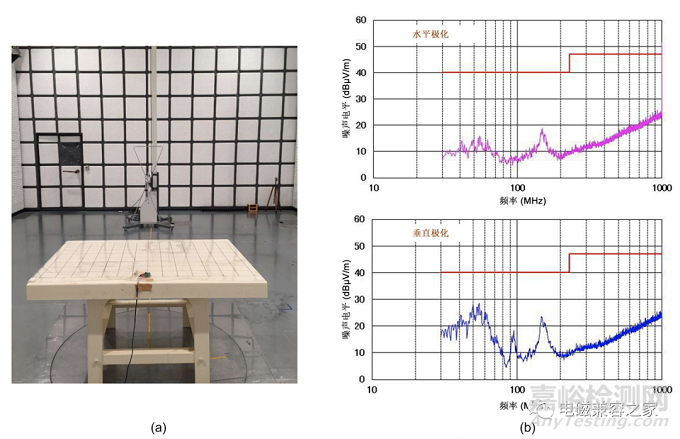 圖 6:CISPR 22 輻射 EMI 測(cè)試:測(cè)試裝置照片 (a);水平和垂直極化天線的輻射 EMI 結(jié)果 (b)