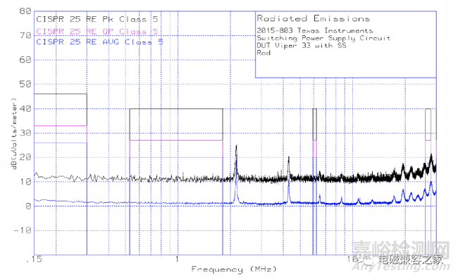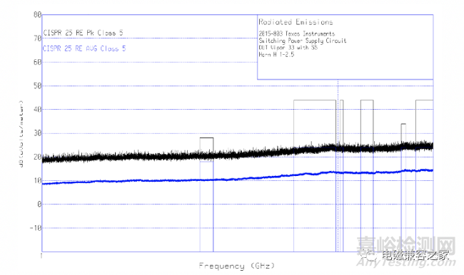 圖 6 所示為 LMR16030 60V/3A 降壓轉(zhuǎn)換器輻射發(fā)射測(cè)試裝置的照片和結(jié)果。測(cè)量條件為 24V 輸入、5V 輸出、3A 負(fù)載電流和 400kHz 開關(guān)頻率。